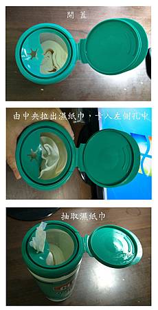 使用方式很簡單,開蓋後,從中央拉出濕紙巾,卡入左側的孔中,然後就可以像一般抽取式的濕紙巾一樣抽取使用喔
